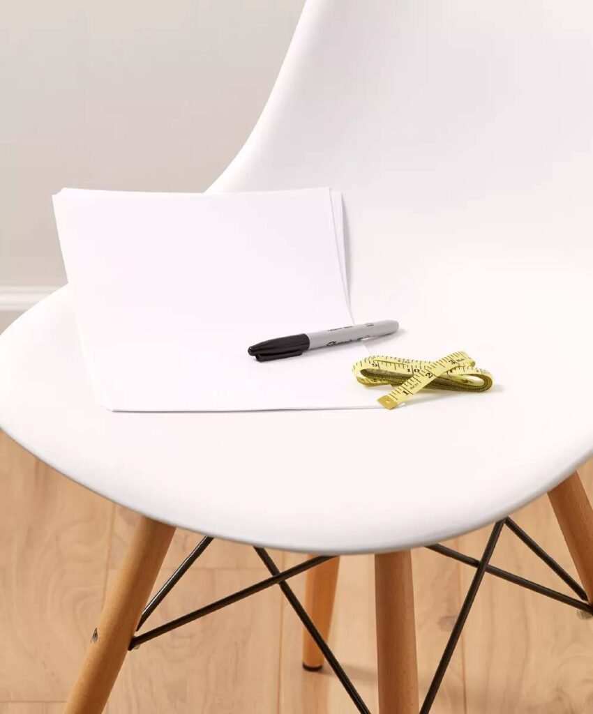 - Prepare a chair, a piece of A4 paper (or larger), a pen, a soft ruler (for circumference measurement) and a straight ruler (for length/width measurement).